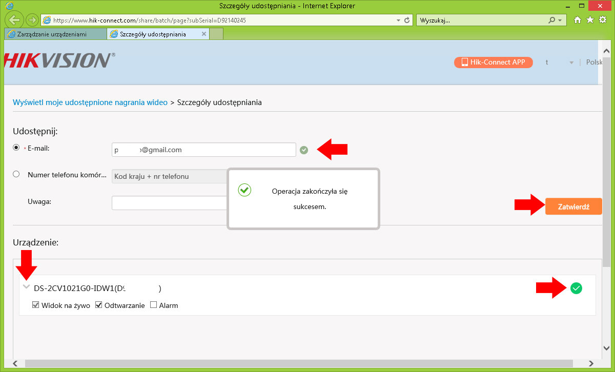 Velg enheten du vil dele, velg alternativene (Live view, Avspilling eller Alarm)