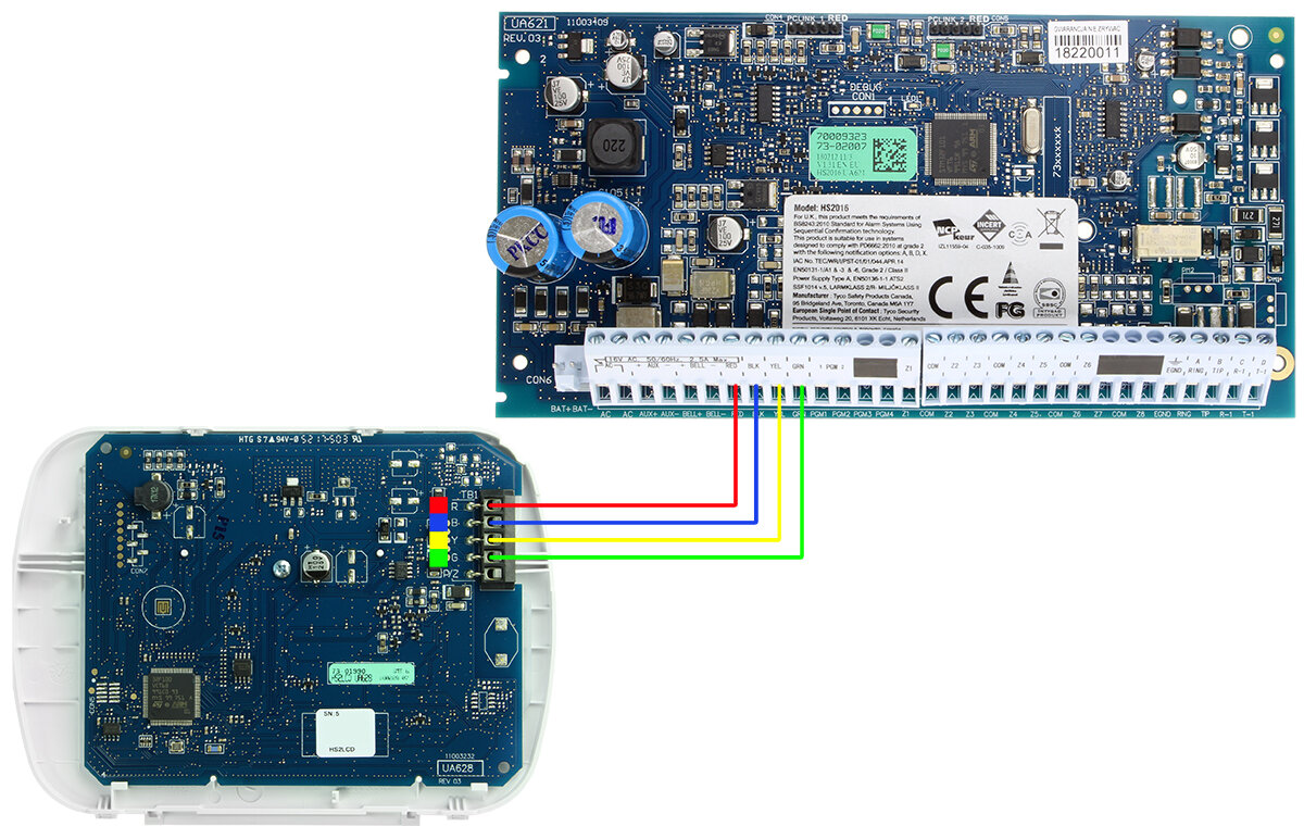 Tilkoblingsskjema for DSC tastatur HS2LCD, HS2LEDE1 til DSC hovedkort HS2016, HS2032, HS2064: