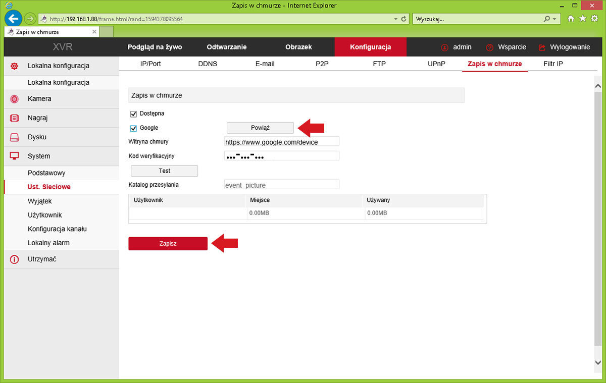 Gå til System / Nettverksinnstillinger / Fanen Nettskyopptak.