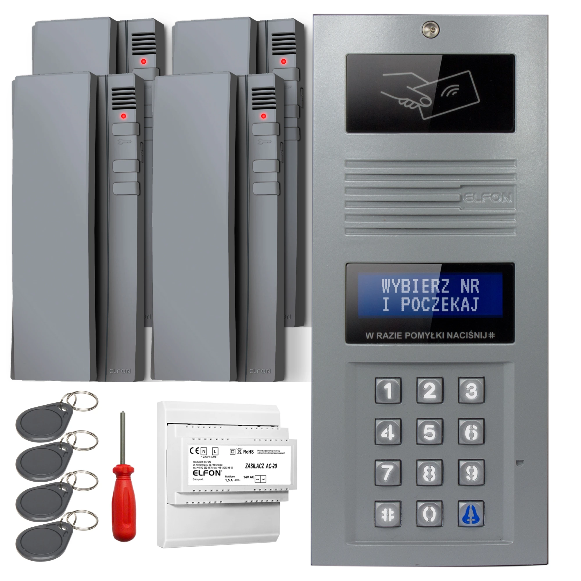 Zestaw domofonowy cyfrowy składający się z panelu z klawiaturą numeryczną i wyświetlaczem, czterech słuchawek, breloków RFID, śrubokręta oraz modułu elektronicznego. Panel frontowy posiada miejsce na kartę zbliżeniową i przyciski do wprowadzania kodu.