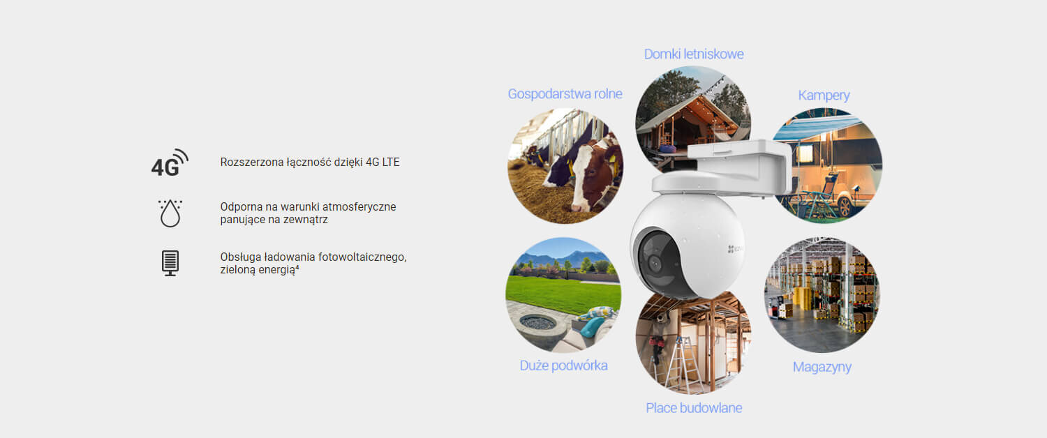 Wi-Fi og strømtilgang er de største utfordringene ved utendørs overvåking. EZVIZ EB8 4G/LTE endrer spillereglene ved å fungere på batteristrøm over et 4G-nettverk. Enheten er regn- og snøbestandig og kan lades med solenergi via et kompatibelt solcellepanel.
