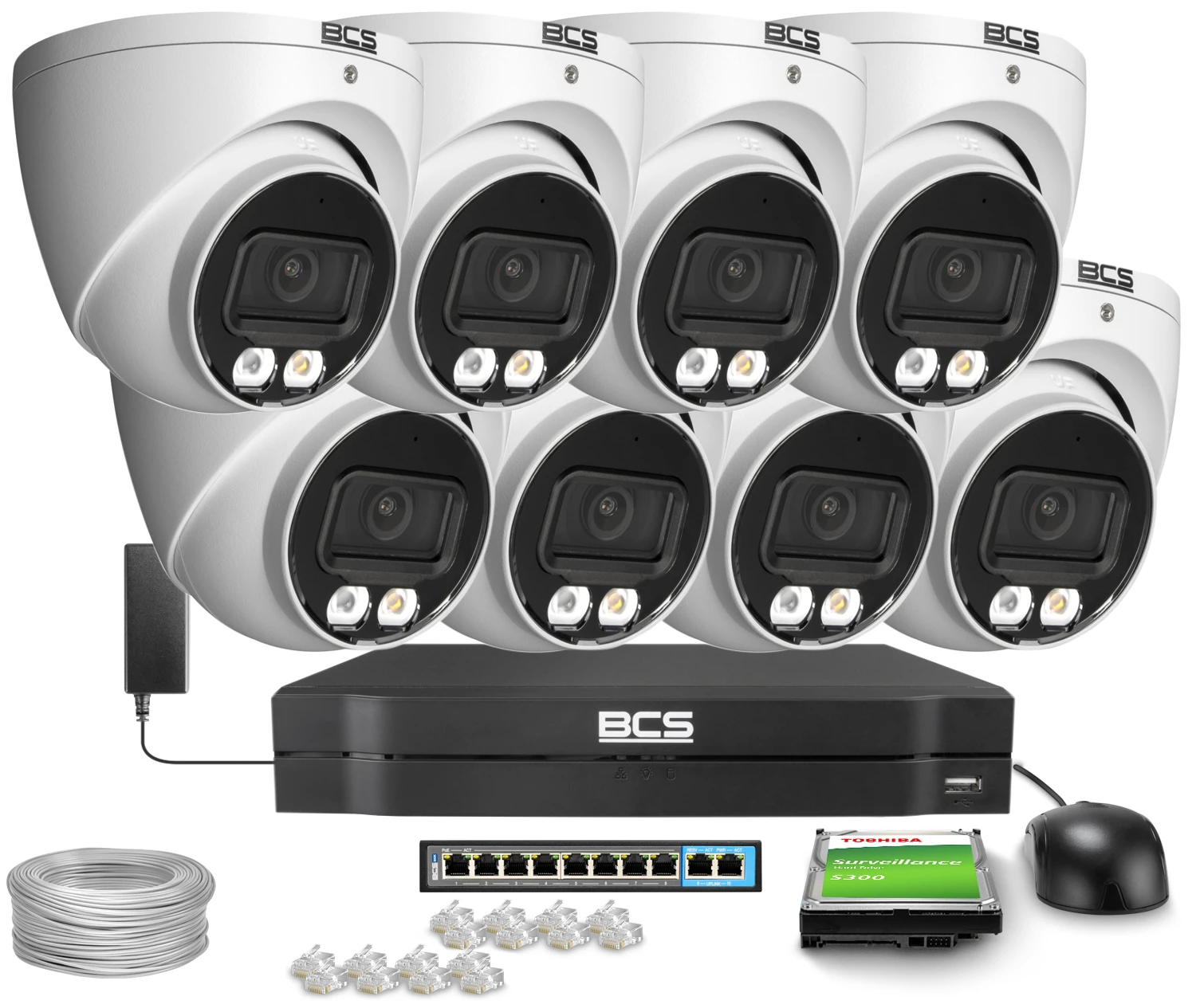 Zestaw do monitoringu IP 8x BCS-L-EIP112FCR3L3-Ai1 12Mpx, NightColor Whitelight 30m, WDR120dB, Sztuczna inteligencja